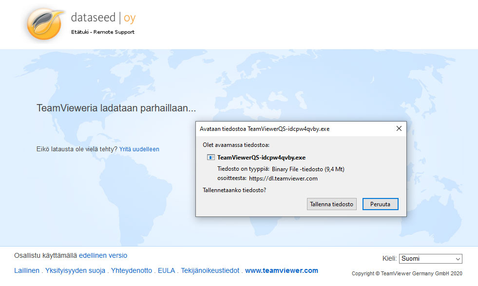 Dataseed etätukiohjelman lataaminen avaa nettisivun, jossa kerrotaan, että tiedostoa ladataan parhaillaan. Samalla selain käynnistää tiedoston lataamisen ja sinun tulee tallentaa tiedosto koneellesi (Firefox).